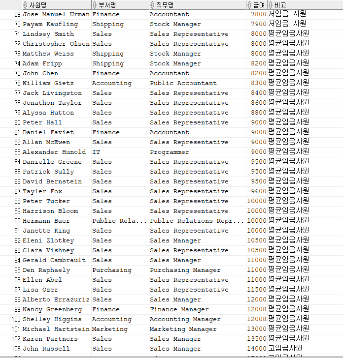 위와 같이 출력이 되며 급여를 기준으로 3구간으로 나눠서 저임금, 평균임금, 고임금 사원으로 나눈 결과이다.