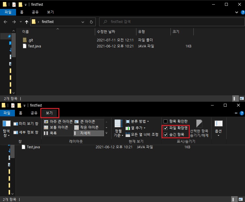 - 생성된 게 보이지 않는다면 보기 탭에서 숨김 항목에 체크를 해주면 숨김 폴더가 나올 것이다.