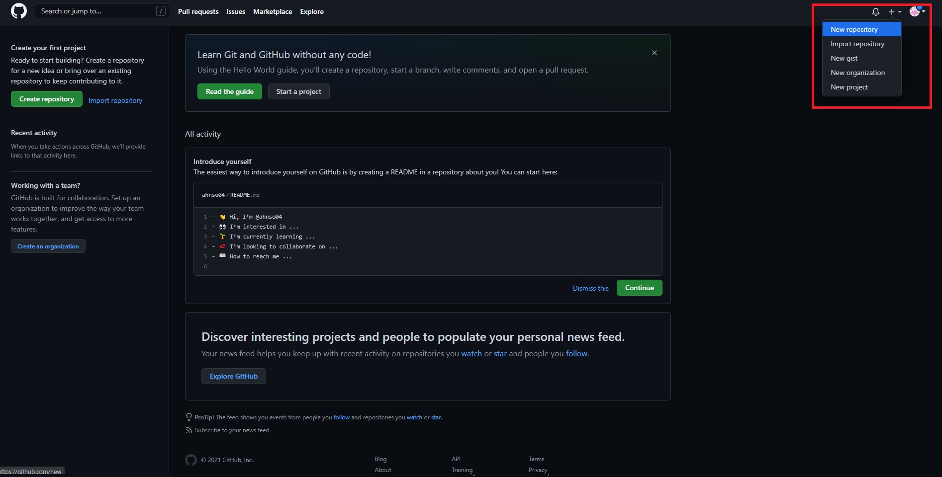 플러스 버튼을 누르면 메뉴가 나오는데 New repository를 눌러 새로운 repository를 만들러 가보자.