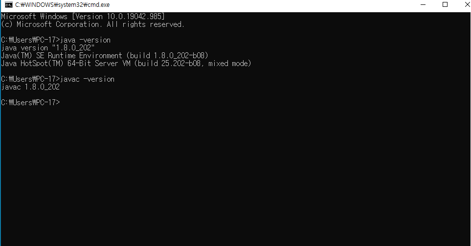 Ctrl + R => cmd 입력 => java -version과 javac -version을 입력했을 때 아래와 같이 나오면 완료.