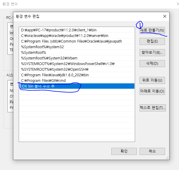 위와 같이 나오는데 새로 만들기 후 JDK의 bin폴더의 주소를 넣어주고 확인해주면 환경변수 설정 끝이다